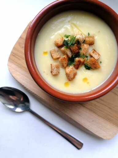 • Krem z pieczonych ziemniaków podajemy z łyżką śmietany i posiekanym drobno cienkim szczypiorkiem.