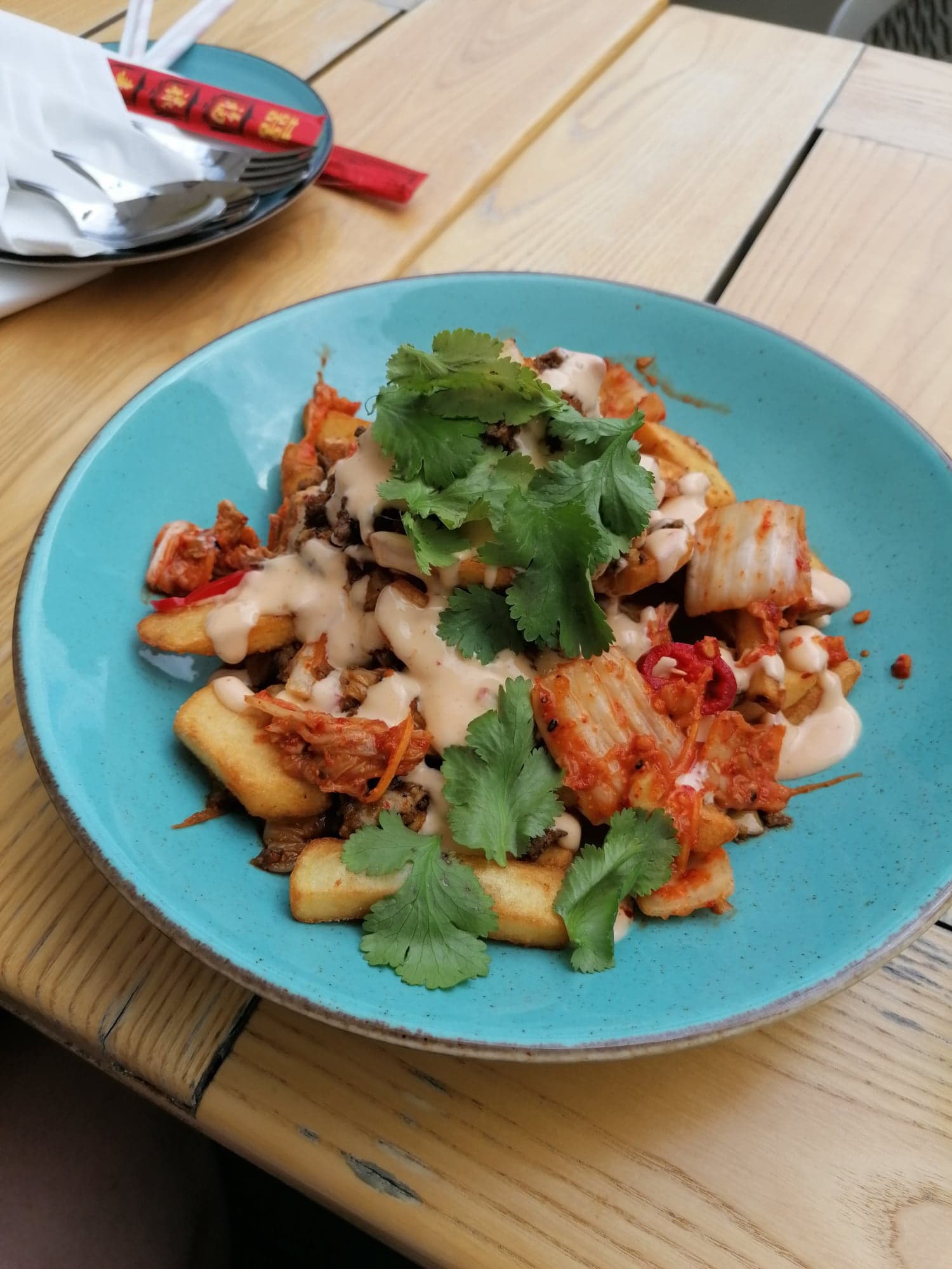 Ostatnim razem zdecydowałam się na koreańskie frytki (31,00zł)- frytki podane z wołowiną, kimchi, sosem majonezowym, chilli i kolendrą, danie zdecydowanie na ostro, jednak bardzo w moim typie. Porcja jest naprawdę spora, trudno było mi ją zmieścić. Mój mąż wybrał makaron Umami (34,00zł), danie zdecydowanie łagodniejsze, makaron z ragout wołowym, szpinakiem, suszonymi pomidorami w sosie serowo- truflowym.