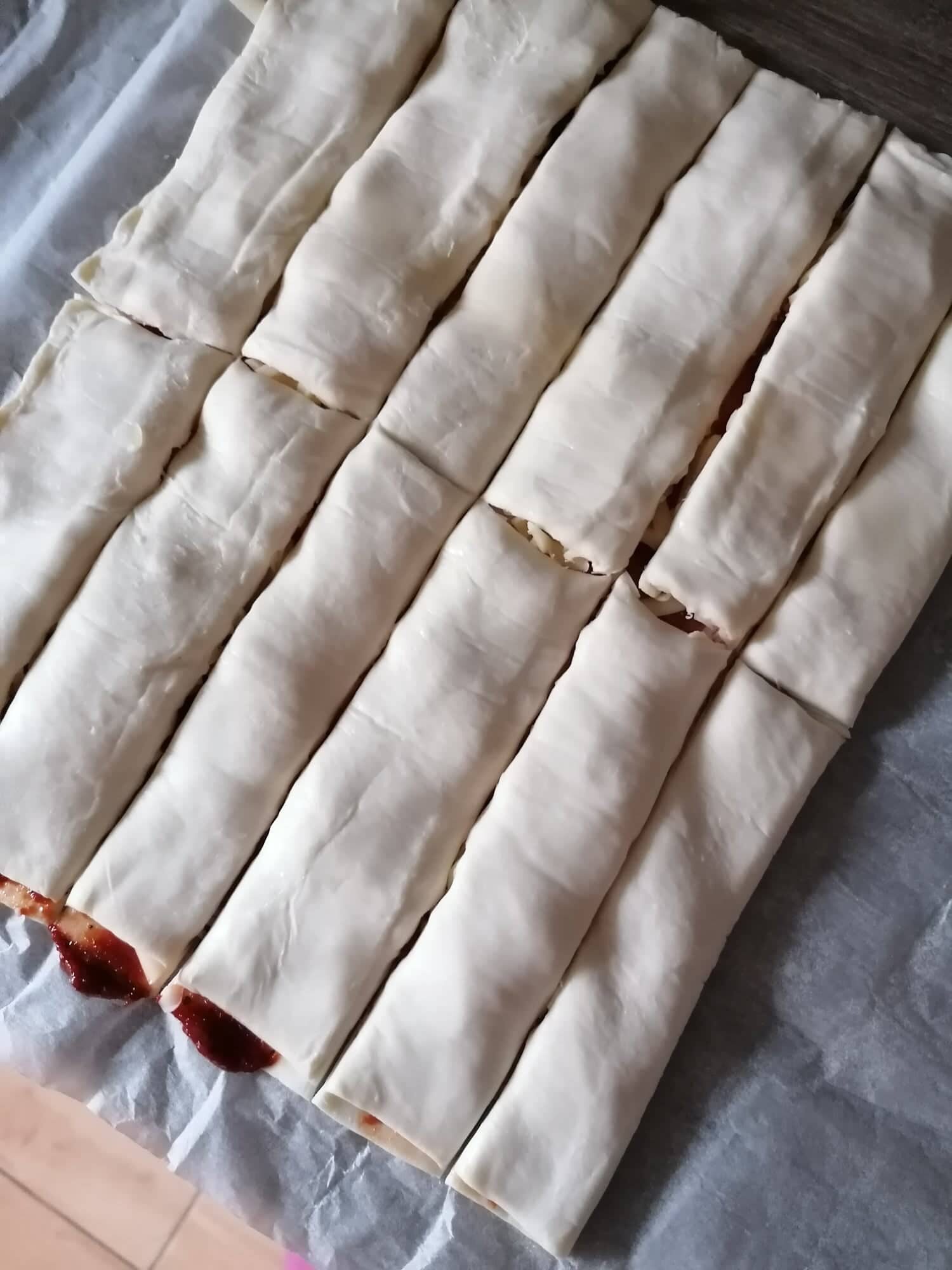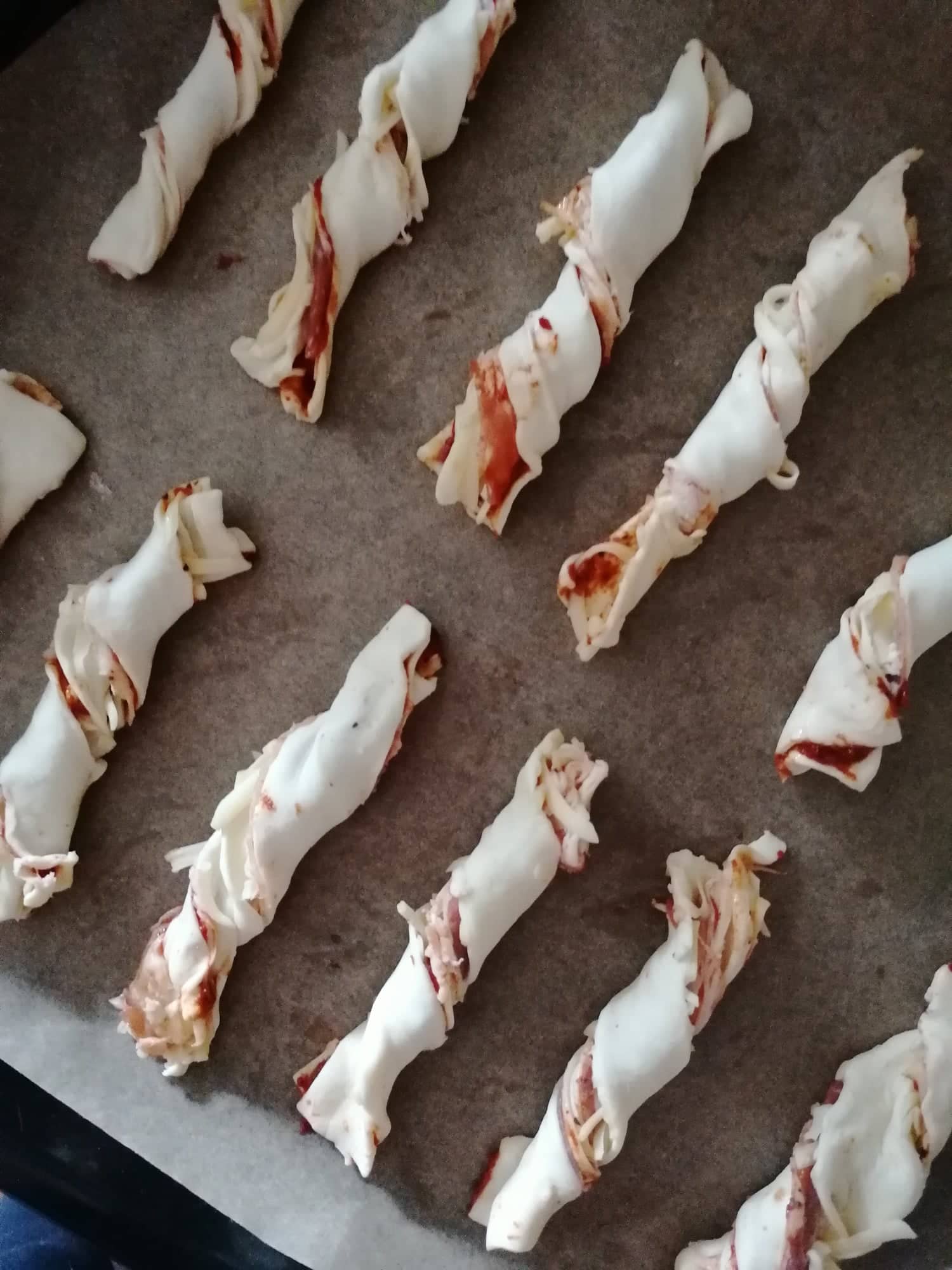 - Ciasto francuskie rozkładamy, smarujemy sosem pomidorowym. Na to układamy plastry boczku i posypujemy startym serem żółtym. Całość przykrywamy drugim plastrem ciasta francuskiego. Kroimy ostrym nożem w poprzek na dwa długie pasy, a następnie każdy z nich na 12 pasków. Następnie każdy pasek ostrożnie skręcamy i układamy na wyłożonej papierem blaszce.