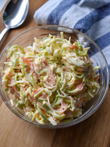 • Kapustę kroimy w paski, a resztę w kostkę. Wszystkie składniki umieszczamy w misce, dodajemy ketchup i majonez i mieszamy. Raczej nie będzie konieczne doprawianie solą i pieprzem, ale jeśli tego potrzebujecie, śmiało dodajcie.