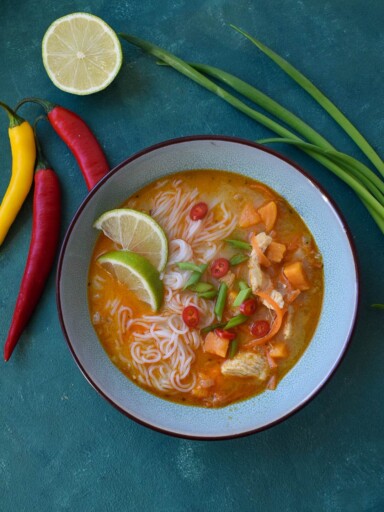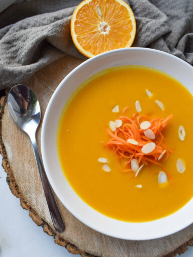 Nie tylko pięknie wygląda, ale i pysznie smakuje! Lekko słodka, delikatna zupa, można podawać ją z grzankami, śmietanką czy prażonymi płatkami migdałowymi. Jeśli lubicie, możecie pokusić się również o doprawienie jej dodatkowo imbirem.